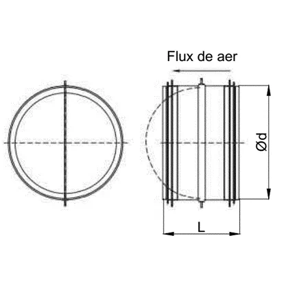 Clapeta circulara anti-retur cu inchidere etansa, este realizata din otel zincat cu lamelele din aluminiu. Lamelele sunt mentinute in pozitia inchis cu ajutorul unui arc, fiind evitata patrunderea aerului din exterior. Clapeta anti-retur cu inchidere etansa (garnitura interioara) permite trecerea fluxului de aer doar intr-un singur sens.