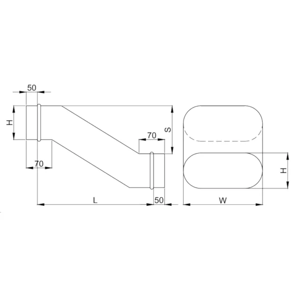 Piesa deviatie de tip „S” pentru conducte ovale este folosita pentru diferentele de nivel si ocolirea obstacolelor ce pot aparea pe traseul tubulaturii. Este confectionata din otel zincat.