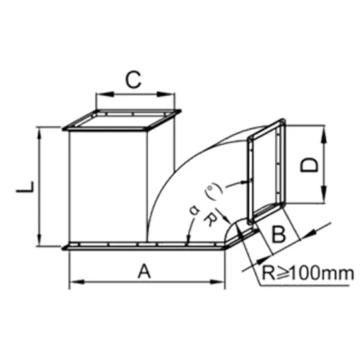 Ramificatia cu un sens lateral si cu altul de mentinere a directiei este folosita in sistemele de climatizare si ventilatie pentru realizarea de deviatii in tronsoanele de tubulatura, in vederea evacuarii sau introducerii cat mai uniforme a aerului din incapere. Este confectionata din tabla zincata. Se executa standard cu raza R=100 si α=90⁰.